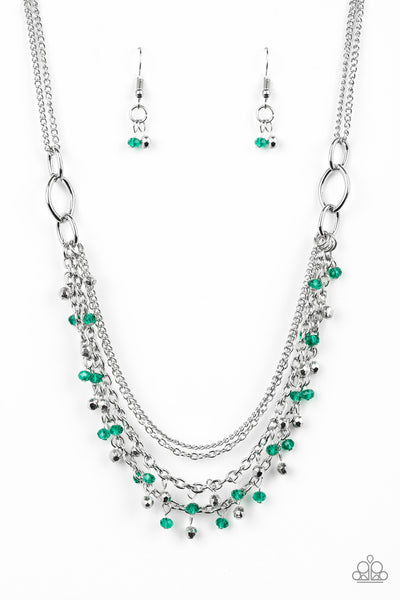 Dainty silver and green crystal-like beads cascade from two shimmery silver chains. Infused with plain silver chains, the colorful strands layer below the collar for a flirtatious look. Features an adjustable clasp closure.