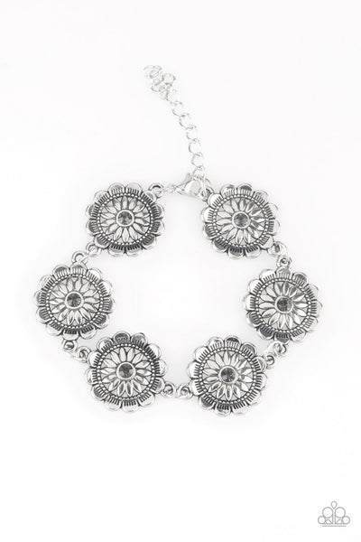 Dotted with smoky rhinestone centers, ornate silver floral frames link across the wrist for a seasonal look. Features an adjustable clasp closure.