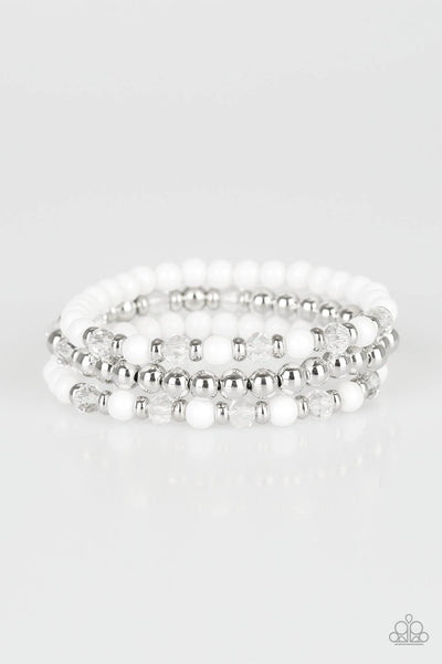 A collection of polished white, shiny silver, and faceted crystal-like beads are threaded along stretchy bands, creating colorful layers around the wrist.