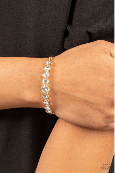 Attached to gold bars, a sparkling series of heart cut white gems are encased in glistening gold frames that curve into a flirtatious centerpiece atop the wrist. Features an adjustable clasp closure.