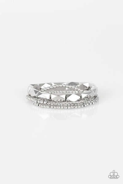 Dainty silver beads and faceted silver accents are threaded along stretchy bands and stacked across the wrist for a bold industrial look.