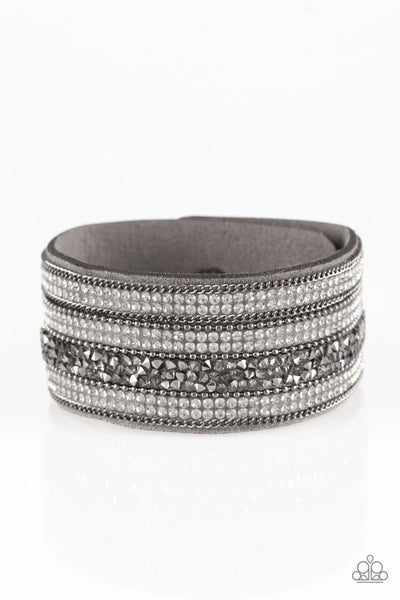 Rows of shimmery gunmetal chains, smoky rhinestones, and metallic prism rhinestones are sprinkled along a thick gray suede band for a sassy style. Features an adjustable snap closure.Sold as one individual bracelet.