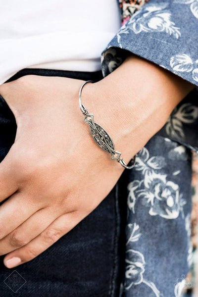 An almond shaped frame is filled with vintage textures and nestled between two sleek silver bars for a minimalistic look.
