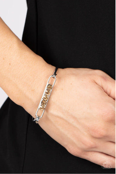 Encased in silver square fittings, a row of golden topaz rhinestones are fitted in place along an airy silver frame that hinges to the center of a bangle-like bracelet for a timeless finish. Features a hinged closure.