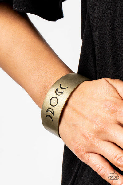 The phases of the moon are engraved across the front of a thick, antiqued, brass cuff, creating an effortlessly celestial statement piece.