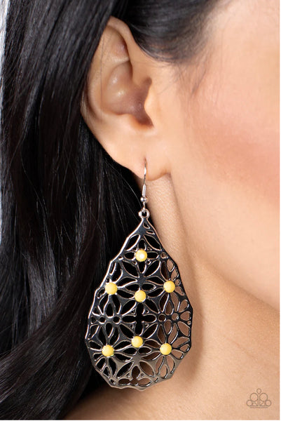 Illuminating beads are scattered across a teardrop frame filled with abstract floral filigree creating a whimsical lure. Earring attaches to a standard fishhook fitting.