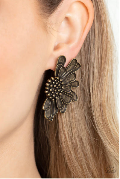 Imperfect brass petals bloom from a studded center, layering into a rustic half blossom for a whimsical flair. Earring attaches to a standard post fitting.