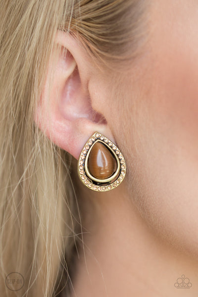 Encrusted in golden topaz rhinestones, a radiant brass ribbon spins around a glowing brown moonstone center, creating a refined teardrop. Earring attaches to a standard clip-on fitting.