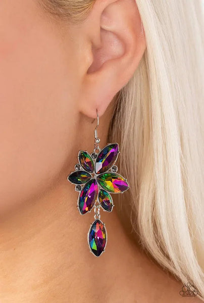Infused with dainty hematite rhinestones, an oversized collection of oil spill marquise cut rhinestones explodes into an iridescent frame. A matching oil spill gem swings from the bottom of the clustered frame, adding sparkly movement to the jaw-dropping design. Earring attaches to a standard fishhook fitting.