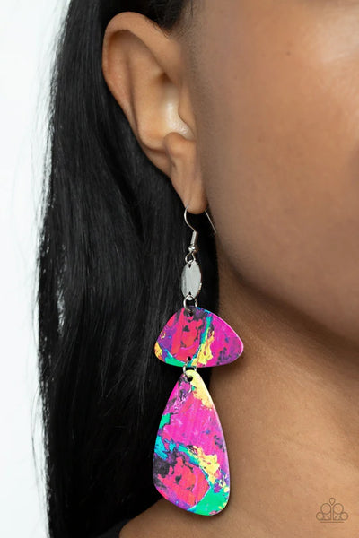 Painted in abstract multicolored details, a pair of asymmetrical frames swing from the bottom of a dainty silver disc for an artsy look. Earring attaches to a standard fishhook fitting.