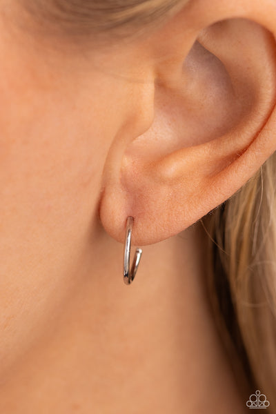 A glistening silver bar curves into a classic hoop, creating a dainty peek of shimmer around the ear. Earring attaches to a standard post fitting. Hoop measures approximately 1/2" in diameter.
