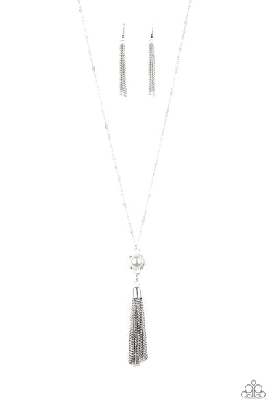 A pearl dotted frame gives way to a shimmery silver chain tassel, creating a timelessly stacked pendant at the bottom of a lengthened silver chain. Features an adjustable clasp closure.