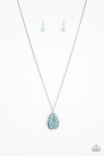 Stenciled in a whimsical floral pattern, an airy silver teardrop frame overlaps a glowing blue cat's eye stone, creating a colorful pendant at the bottom of a lengthened silver chain. Features an adjustable clasp closure.