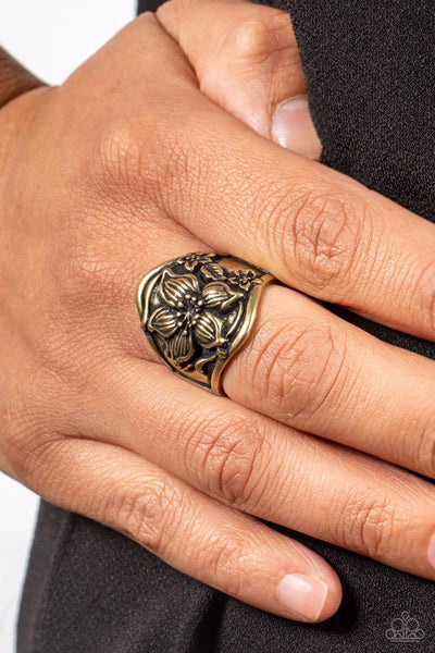 Brushed in antiqued details, a tropical floral motif blooms across an oversized brass frame for a whimsical dash of island inspiration. Features a stretchy band for a flexible fit.