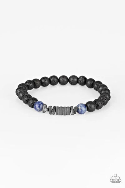 An earthy collection of metallic accents, refreshing blue stones, and black lava beads are threaded along a stretchy band around the wrist for a seasonal look.