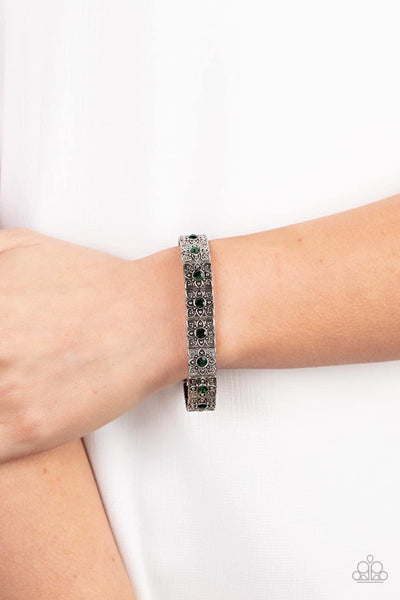 Dotted with dainty green rhinestone centers, floral filigree embossed silver frames are threaded along stretchy bands around the wrist for a romantic pop of color.