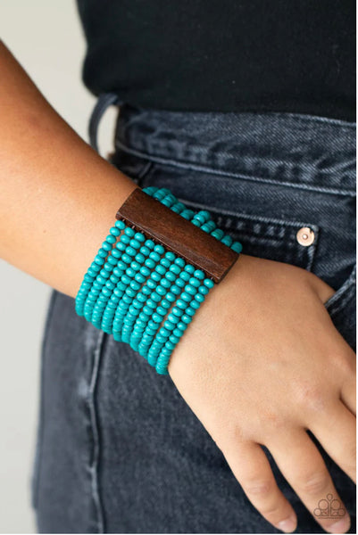 Held together with brown wooden rectangular frames, rows of refreshing blue wooden beads are threaded along stretchy bands around the wrist for a whimsically layered look.
